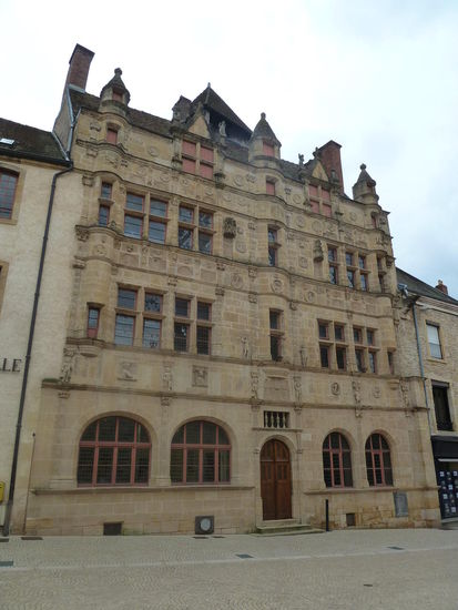 Ulrike hatte vorher noch gesagt, es wäre gut dass es nicht so kalt wie in Pottenstein wäre und auch der Regen nicht so intensiv. Daher fängt es nun an zu regnen. Der Stadtrundgang beschränkt sich daher auf eine Fassade des Hotel de Ville (la maison Jayet) - errrichtet zwischen 1525 und 1528 im Renaisancestil für den reichen Kaufmann Pierre Jayet - und seit 1862 Rathaus-