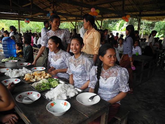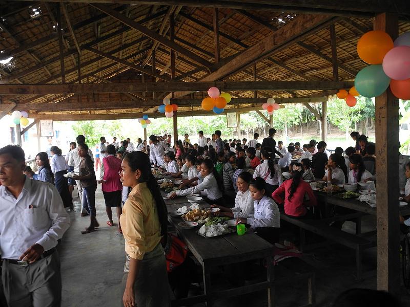 Anschließend zeigen Ponlok und eine ihrer Freundinnen mir und Dani den Schulgarten und erklären, welche Gemüse- und Obstsorten dort wachsen. Und wenn sie uns fragen, ob das auch in Deutschland wächst, müssen wir meistens "nein" sagen - und sie finden, wir wären arm dran, weil doch bei uns scheinbar nur Kartoffeln gut gedeihen, und nicht einmal Reis wächst - aber wir können es im Supermarkt kaufen, weil es aus Ländern wie Kambodscha zu uns gebracht wird. Sie staunen und wollen wissen, ob ein Markt bei uns aussieht, wie bei ihnen. Wie sollen wir ihnen nur erklären, was ein Supermarkt in Deutschland ist? Auf jeden Fall ganz anders, als ein Markt in Kambodscha. Sie zeigen uns auch die Klassenzimmer: den Englisch-Raum, den Mathematik-Raum... Und dann dröhnt plötzlich laute Musik aus der hoch aufgetürmten Anlage, die den Strom aus einem Generator bezieht, denn einen Anschluss an ein noch nicht vorhandenes Stromnetz hat die Schule nicht. Die Mädchen freuen sich auf die nun eröffnete Party. Die Schüler tanzen ganz anders, als wir es von zu Hause gewohnt sind. Sie formieren sich im Kreis um einen Abstützbalken der Überdachung des nach allen Seiten offenen Speiseraumes und bewegen sich im Takt der Musik rund um diesen Balken. Die Mädchen bewegen dazu ihre Hände sehr grazil. Später werden auch Gesangseinlagen dargeboten mit Unterstützung elektronischer Musik und ohne. Es gibt viel Beifall für die kleinen Künstler. Der Bürgermeister des Dorfes beweist sich dabei als ein hervorragender Moderator und Stimmungsmacher.
