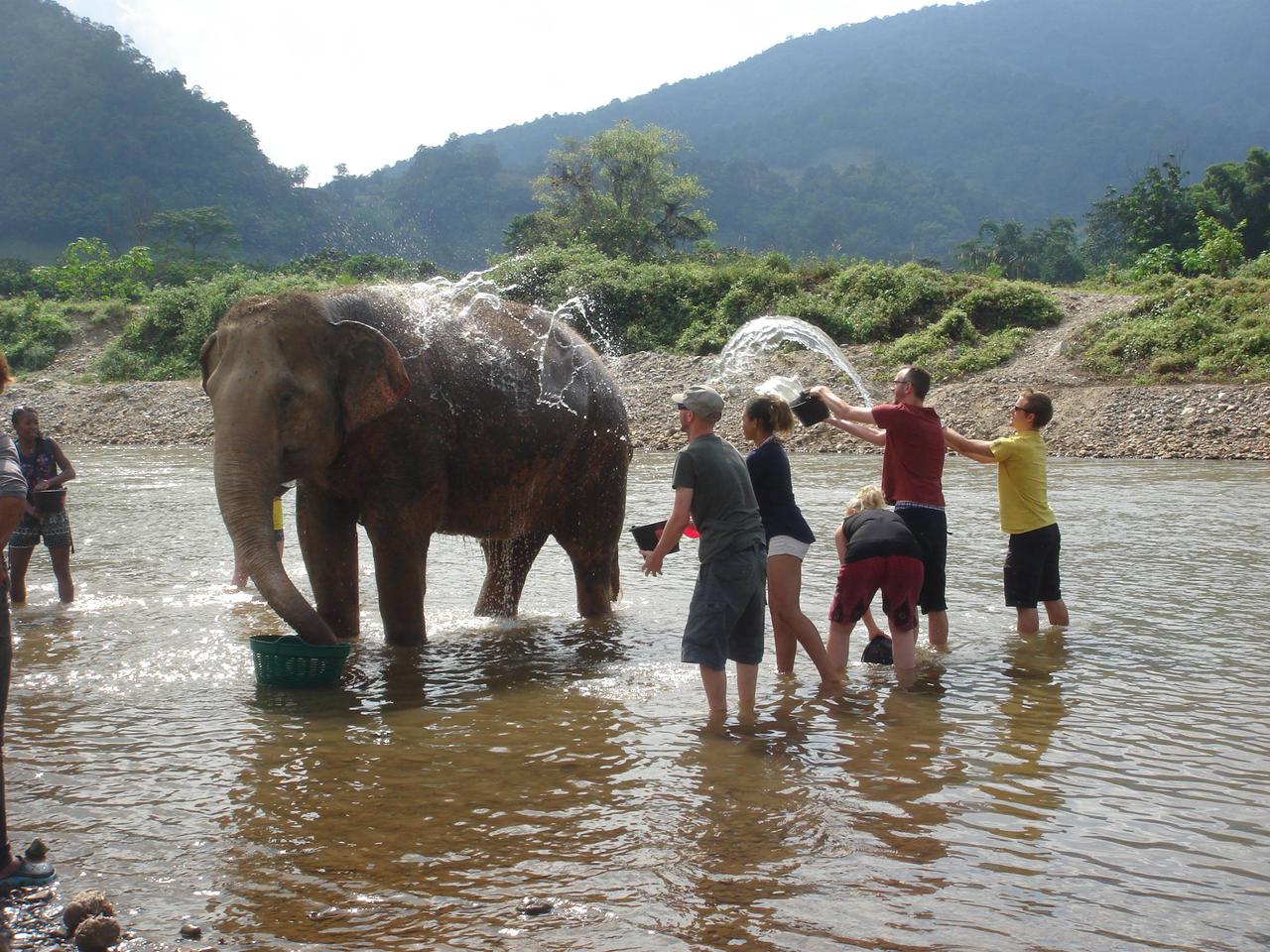 Das sah dann so aus, dass alle 20 Meter ein Elefant im Wasser stand und mal wieder am futtern war aus einem daneben stehenden Wäschekorb. Währenddessen durften die Besucher, also wir, mit Eimern Wasser auf den Elefanten kippen. Dabei musste man schon ganz schön viel und feste schöpfen, um die Schlammkruste einigermaßen von der Haut zu bekommen. Das Waschen an sich ist wohl auch wichtig, damit sich auf der Haut und an den Borsten keine Parasiten ansetzen können, allerdings sah es uns auch etwas arg nach Touri-Beschäftigung und -Unterhaltung aus, die der Elefant halt mampfend über sich ergehen ließ...mit seinem Rüssel wäre er wohl effektiver gewesen