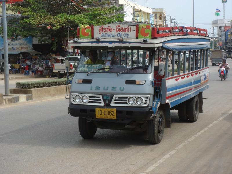 Das sind die öffentlichen Busse, ohne Fenster und Türen, mit 2 Holzbänken zum draufsitzen im Inneren. Mit so einem Bus sind wir dann am nächsten Morgen nach Alt-Sukhothai aufgebrochen.