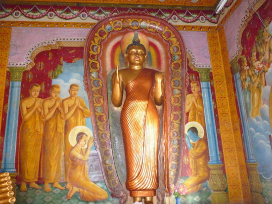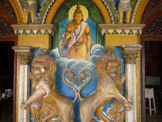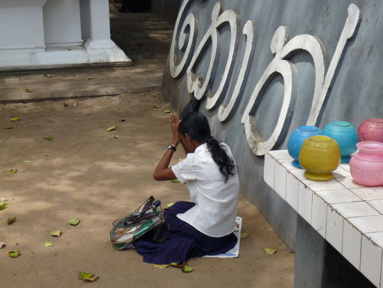 Um elf setzten wir uns in Mallis Tuk Tuk - das nächste Highlight für Nico. Endlich wieder Tuk Tuk fahren. Wir wollen in die etwas größere Stadt Panadura (immerhin 10.000 Einwohner) zum Einkaufen und ein wenig Sightseeing. Als erstes steuert Malli den 200 Jahre alten buddhistischen Tempel an. Er ist unspektakulär aber schön. Er erzählt uns einiges über ihn und über den Buddhismus bzw. die Bedeutung der Fahnen und Farben und die Bedeutung der verschiedenen Körperhaltungen des Buddha. Dann tuckern wir ein wenig durch die Stadt unter anderem vorbei am Markt, wo man den Fisch riechen kann und schließlich zum Supermarkt, um Getränke zu kaufen. Wir schlendern noch durch die Seitengassen und kommen vor dem Bezirksgericht mit zwei Männern, einer jünger, einer älter, ins Gespräch. Sie sind sehr nett und fragen uns ganz unaufdringlich ein wenig aus. Nach einer größeren Runde, bei der Nico ein riesiges Bananenblatt als Sonnenschirm bekommt - die Leute, die ihn damit sehen, müssen grinsen - landen wir wieder beim Supermarkt, wo Malli auf uns wartet. Weil es hier keine Frischmilch gibt, laufe ich ein Stück die Hauptstraße entlang zum COOP, aber auch hier gibt es nur H-Milch und es stinkt übel nach Trockenfisch. Auf dem Rückweg zum Tuk Tuk kaufe ich gefüllte Rotis für den kleinen Hunger zwischendurch.