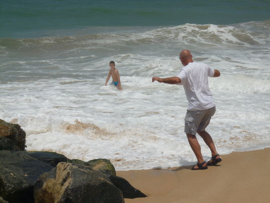 Um die Straßenverhältnisse und den Verkehr allgemein vor unserer langen Tour zum Sigiriya besser einschätzen zu könne, entscheiden wir uns, unseren ersten Ausflug entlang der Küste bis runter nach Weligama zur Südspitze zu unternehmen. Unterwegs sehen viele Einheimische, die zum Schutz vor der Sonne ihre Regenschirme aufgespannt haben aber keiner trägt eine Sonnenbrille. Im Dorf Moggana, durch das wir fahren, stinkt es furchtbar nach Trockenfisch, der in der Sonne ausgebreitet wurde. Bei Kahawa entdecken wir einen wunderschönen einsamen Strand und machen Halt, damit Nico ins Meer gehen kann. Es herrscht starker Wellengang, aber der Strand ist sehr breit und außer uns ist hier keine Menschenseele zu sehen. Die Leute in den vorbei fahrenden Autos hupen winken, wenn sie uns sehen.