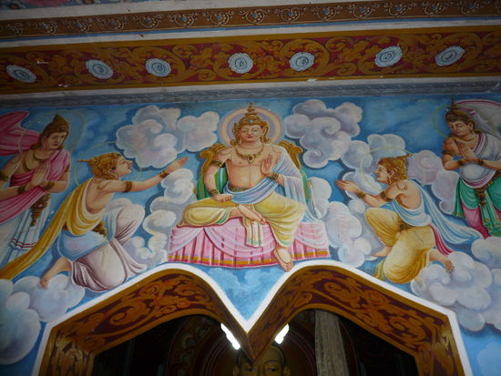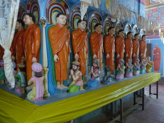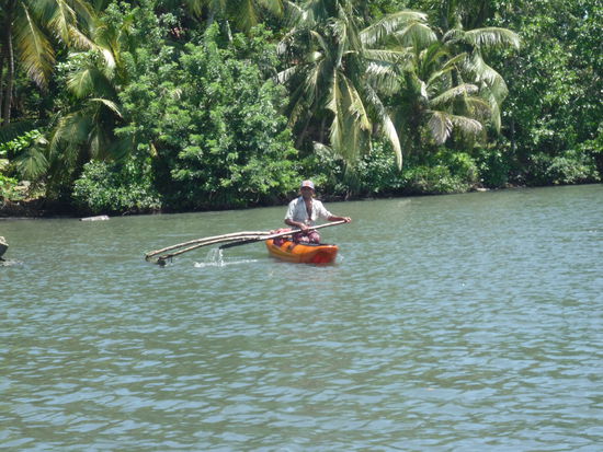 In Kogalla machen wir einen Abstecher für eine so genannte Bootssafari. An einer Hütte, bei der wir wenden müssen, wird Nico seine ersten Spielzeugautos los, als zwei Kinder kommen, um uns zu begaffen. Wir tuckern dann ca. eine Stunde auf dem Salzwassersee, sehen die Zimtinsel und statten der Tempelinsel einen Besuch ab. Dort bringt uns ein kleiner Mönchsjunge einen riesigen Schlüssel, um in das Tempelinnere zu gelangen. Der ist recht klein und bescheiden aber hübsch bunt angemalt mit vielen Bildern und verschiedenen Statuen. Außer einigen Adlern im Zwergformat und Kormoranen sehen wir während der Bootsfahrt keine weiteren Tiere. Gleich am Anfang darf Nico das Boot lenken und Gas geben und wir sehen Fischer im Einbaum und eine ganze Familie in einem Kanu.