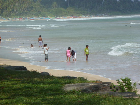 Nach einer kurzen Fahrt erreichen wir Weligama, das fast an der südlichsten Spitze von Sri Lanka liegt, wo die vorgelagerten Riffe die Wellen zähmen, so dass man relativ gefahrlos im Meer baden kann. Überhaupt ist es hier sehr malerisch mit den winzigen Inselchen, den Kühen, die in der Sonne dösen und den bunten Fischerbooten, die am Palmenstrand liegen. Später kommt ein Boot mit seinem Fang zurück, der kurze Zeit später bereits an der Straße zum Kauf angeboten wird. Außer uns sind nur Einheimische zu sehen, die entweder auf den Booten arbeiten oder zum Vergnügen hier sind. Man sieht Pärchen, die am Strand entlang spazieren, Familien mit Kindern und Jungs, die akrobatische Übungen machen. Es fällt auch auf, dass die Gegend hier im Süden nicht ganz so schäbig wirkt. Wahrscheinlich sind die Menschen wohlhabender, weil sich das Touristenzentrum an diesem Abschnitt der Küste befindet.