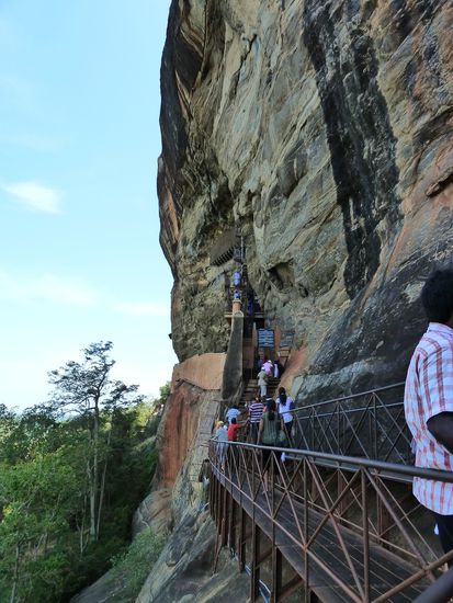 Ähnlich aufdringliche Einheimische haben wir gleich anschließend am Eingang am Hals. Man will unser Auto waschen und wir sollen uns unbedingt die Souvenirs ansehen oder einen Guide engagieren. Als wir auch die endlich los sind, beginnt unser Aufstieg. Bis ganz nach oben sollen es 1200 Stufen sein. Wir nähern uns dem Felsen durch dicke Gesteinsbrocken und über mehrere Treppen und dann erst ragt der Sigirya in seiner vollen Größe vor uns auf. Als Thomas die tatsächliche Höhe und die am Felsen fest gemachten Treppen sieht, ist er kurz davor, wegen seiner Höhenangst auf den Aufstieg zu verzichten.