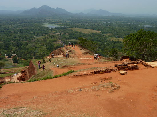 Unser Begleiter placiert uns auf der einzelnen und letzten Stufe inmitten des Plateaus, die das symbolische Ende des Aufstiegs darstellt, und macht das Beweisfoto von uns. Die Aussicht ist schon beeindruckend. Aus 200m Höhe kann man auf der einen Seite ziemlich weit ins Land sehen. Auf der anderen Seite sieht man die Berge bei Nuwara Eliya und Kandy. Nur der Sri Pada ist leider zu weit weg, um sichtbar zu sein. Von den Gebäuden, die hier oben einmal gewesen sind, ist bis auf die umlaufenden Grundsteine nichts mehr übrig, weil sie aus Holz gebaut worden waren. Lediglich der "Swimming Pool" und der steinerne Thron, auf dem das Platz nehmen verboten ist, sind noch intakt. Wir genießen die Aussicht in alle Richtungen und machen uns wieder an den Abstieg.