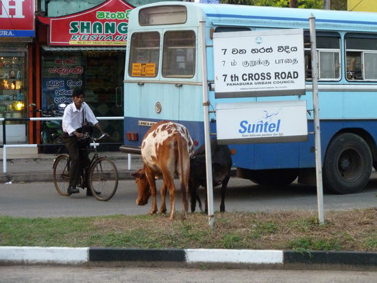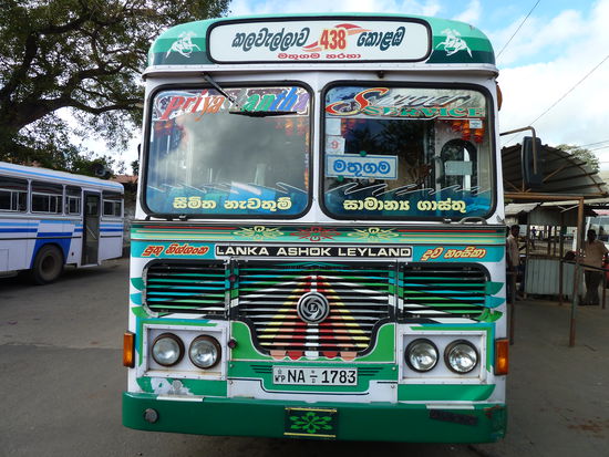 Den Rest der Strecke bis nach Panadura, wollen wir mit dem Henkerbus fahren, der in unmittelbarer Nähe schon bereit steht. Ein dicker Mann, der sieht, wie Thomas von uns im Bus Fotos macht, möchte auch von ihm fotografiert werden. Er scheucht kurzerhand die anderen herbei gelaufenen, die auch noch mit aufs Bild wollen, weg. Als wir einsteigen, sind wir die einzigen Fahrgäste und der Bus fährt auch gleich los. Wir fahren durch die Hauptstadt und mit der Zeit füllt sich der Bus, bis auch noch der letzte Stehplatz besetzt ist. Die Frau, die neben Thomas sitzt - auch hier pennt gleich wieder die Hälfte der Leute - fährt die ganze Zeit im Halbschlaf Kopfkarussell. Nico sitzt am Fenster und sieht raus. Immer wenn Leute ihn sehen, lächeln sie ihn an, manche winken auch. Der Fahrer hat lustige Musik eingeschaltet und die gesamte Windschutzscheibe ist mit Schutzgöttern und Plastikblümchen verziert. So gelangen wir - natürlich begleitet von wildem Gehupe - bis nach Panadura, wo wir in unser am Bahnhof geparktes Auto steigen und ins Hotel fahren.