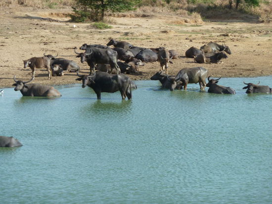 Wir steigen um in einen offenen Jeep, wo sich Thomas gleich die Birne an einer Stange aufschlägt. Wir zuckeln knapp zwei Stunden durch den Park, wobei man im Jeep auch stehen kann, um besser zu sehen. Wir kommen an Wasserstellen, wo sich Krokodile, die regungslos im Wasser liegen, Wasserbüffel und verschiedene Vögel tummeln und zu einem erhöhten Platz, der aus Lava zu sein scheint. Des Weiteren sehen wir einige Adler, einzeln oder in kleinen Gruppen auftretende Elefanten, Hirsche und Schmetterlinge. Als wir an einem allein stehenden Elefanten ziemlich dicht vorbei fahren, macht der einen heftigen und bedrohlich wirkenden Schritt auf uns zu, so dass Fahrer und Ranger ihn lautstark zurückscheuchen müssen. Im Vergleich zu Afrika sind die Tiere in diesem Park relativ spärlich gesät, aber Nico macht die Fahrt im Jeep Spaß und die Safari insgesamt hat uns allen gut gefallen.