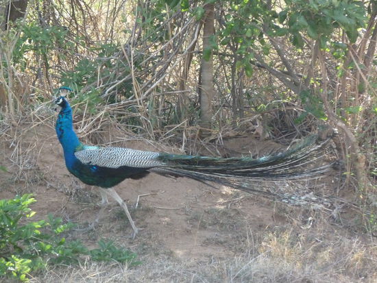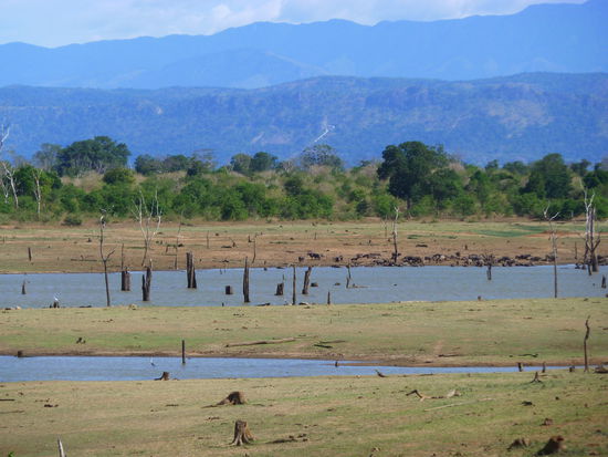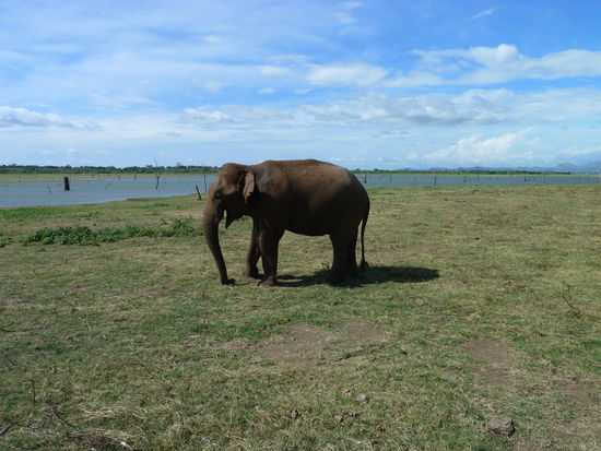 Wir stehen um halb vier auf für die gebuchte Tour in den Nationalpark, denn gestern haben wir unser Auto abgegeben. Wir bekommen unsere Frühstückspakete an der Rezeption ausgehändigt und werden relativ pünktlich abgeholt. Wir haben einen Minibus für uns allein. Es ist noch stockdunkel. Um sechs machen wir einen kurzen Halt, wo man uns die Hütten zur Edelsteingewinnung zeigt und einen größeren Steinbuddha in einiger Entfernung. Es kommt auch gleich eine Frau angeschlurft, die uns ihre Edelsteinausbeute in einem aufgeschlagenen Taschentuch zeigt, aber wir wollen nichts kaufen. Mit Blick auf die aufgehende Sonne geht es weiter. Um zum Eingang des Nationalparks, den wir nach insgesamt dreieinhalb Stunden Fahrt erreichen, zu gelangen, müssen wir einen Stausee überqueren und sehen am Zaun schon die ersten Elefanten und einen Pfau stehen.
