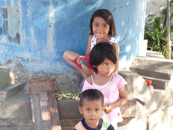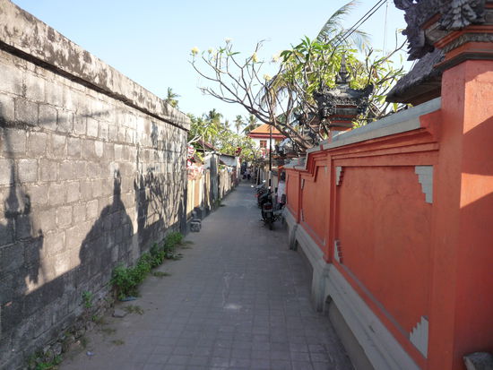 Um vier gehen wir ans Meer vor unserem Hotel, eigentlich auf der Suche nach einem Strandrestaurant, aber diese sind entweder nicht vorhanden oder nicht geöffnet. Das bleibt auch so, als wir ein andermal zu einer wesentlich späteren Zeit nachsehen. Wir schlagen uns in die Seitengassen des Dorfes, wo uns gleich ein Angestellter aus unserem Hotel begegnet, mit dem Thomas gekickert hat und uns einlädt, morgen um sechzehn Uhr an einer Zeremonie beim Dorftempel teilzunehmen. Es handelt sich dabei um das TUMPEK LANDEP, die Segnung aller Geräte aus Metall. Die Kinder, die uns in den Gassen begegnen, grüßen uns fröhlich und lassen sich bereitwillig fotografieren. Auch die Erwachsenen, die uns begegnen, sind alle sehr freundlich und unaufdringlich.