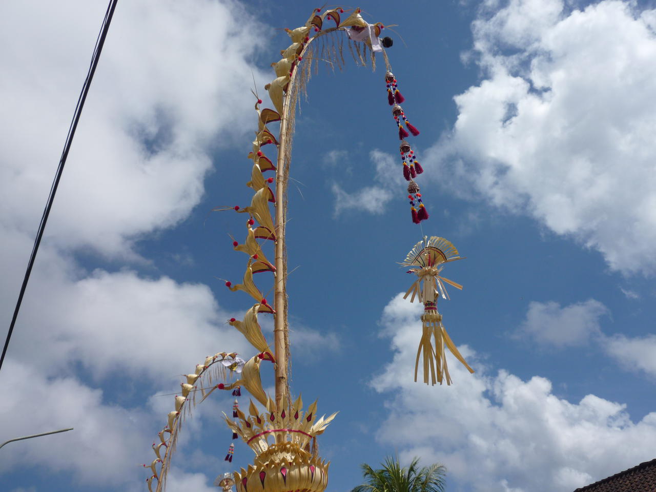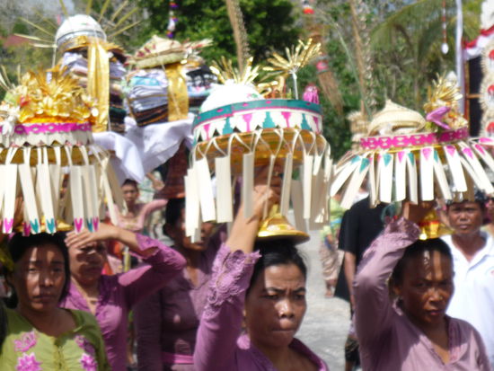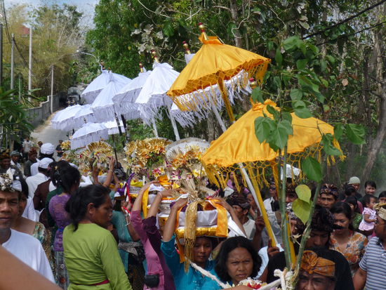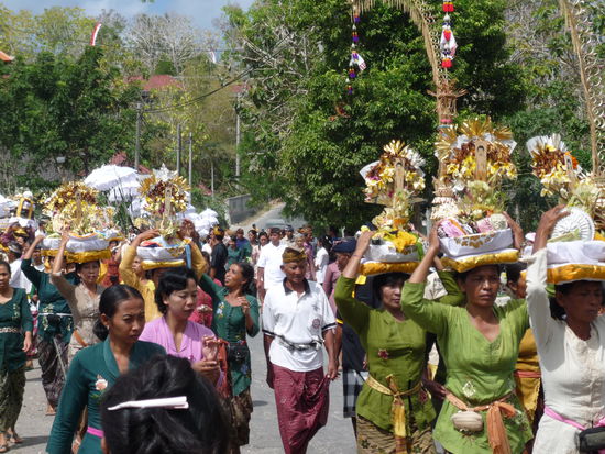 Wir wollen im Meer baden und haben uns dafür den Ort Jimbaran ausgesucht, weil der an der Westküste ist, wo es die guten Wellen gibt und wir nicht an Kuta vorbei müssen. Leider erwischen wir wieder mal die falsche Ausfahrt und fahren in den tiefsten Süden nach Uluwatu. Da wir Zeit haben und die Landschaft schön ist, fahren wir einfach weiter - vielleicht gibt es hier auch einen schönen Strand. Plötzlich wird die Straße vor unserer Nase mit einem HATI HATI Schild abgesperrt und wir müssen anders fahren als geplant. Es geht rauf und runter, die Möhre macht zuweilen kleine Sprünge, aber nirgends kommt man so recht ans Meer. Wir enden dann auf der anderen Seite der Absperrung und sehen jetzt den Grund dafür. Hier findet eine Prozession zum Tempel statt. Die Frauen tragen die Opfergaben auf ihren Köpfen und die Männer die orangen oder weißen kleinen Stoffschirme und begleiten den Zug mit ihrem Singsang. Im vorbei Gehen werden sie mit geweihtem Wasser besprengt. Wie die balinesischen Schaulustigen stelle ich mich an den Straßenrand und mache Bilder bis Thomas drängelt, das könne nach Auskunft der festlich gekleideten Polizisten noch zwei Stunden so weiter gehen.
