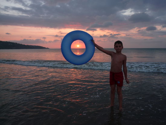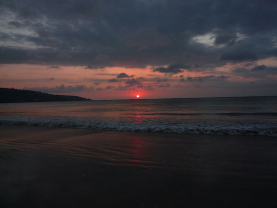 Zum Schwimmen fahren wir wieder nach Jimbaran und erleben dort einen wunderschönen Sonnenuntergang, denn diesmal verschwindet die Sonne nicht so schnell im Dunst.