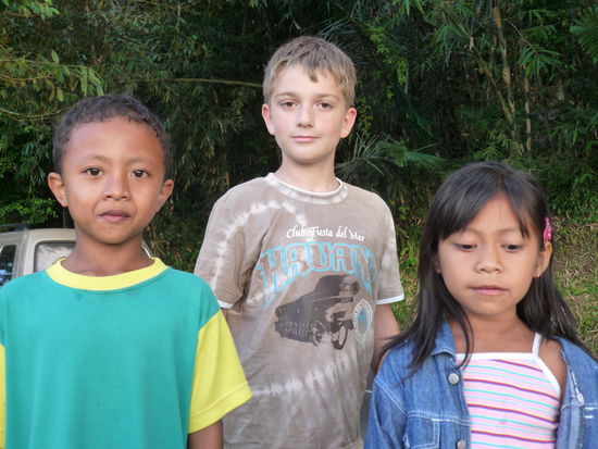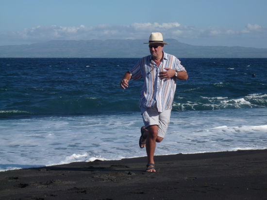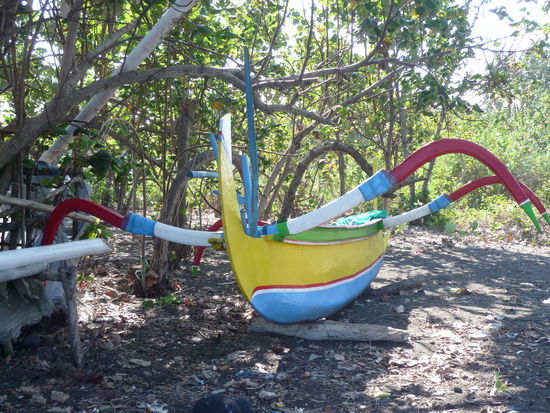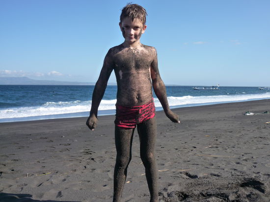 Während wir auf das Essen warten, schmeißt die Betreiberin das Feuer an und fächelt mit einer Pappe die Glut heiß. Die Spieße, die Sauce dazu und die Suppe schmecken überraschend lecker. Wir bezahlen drei Euro und fahren weiter, bis wir Kusamba erreichen. Es handelt sich dabei um ein kleines Fischerdorf und es hat einen nicht sehr gepflegten dafür aber menschenleeren schwarzen Lavastrand. Der Sand ist richtig schwarz und glitzert in der Sonne. Es weht eine gute Brise und die Wellen sind kräftig. Nico vergnügt sich im Wasser und wälzt sich mehrmals im Sand, bis er aussieht wie Batman. Um Nico sauber zu bekommen, schüttet Thomas die fünf Liter Wasser über ihn und die Dorfbewohner sehen belustigt dabei zu.