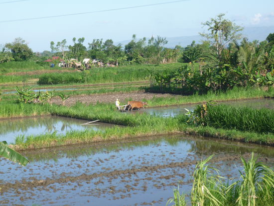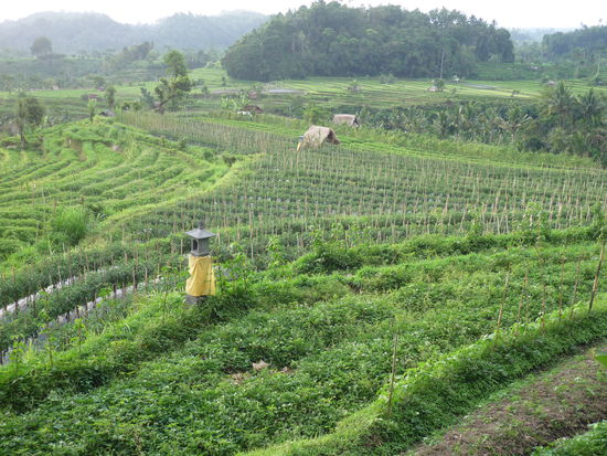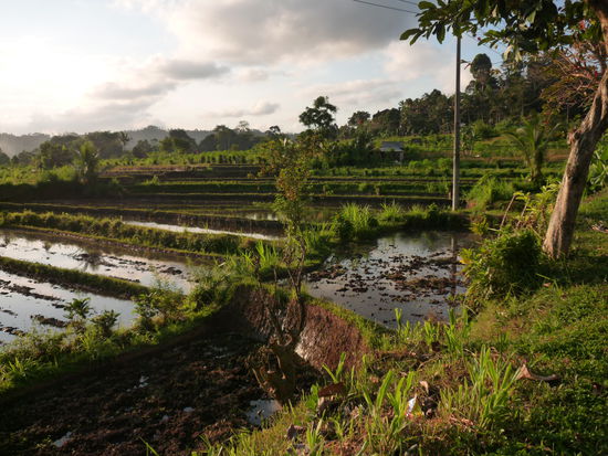 Thomas möchte zu einer Stelle zurückfahren, wo ein Schild zum Rafting einlud, aber wir finden den angegebenen Ort nicht. Nachdem uns die Suche zu dumm wird, schlagen wir den Weg nach Süden ein, wo man einen herrlichen Blick über die Reisfelder auf den Agung hat. Wir fahren durch wunderschöne Täler, in denen die Terrassen angelegt sind und gelangen schließlich nach Sidemen, wo man den Agung richtig gut sieht. Leider ist es schon sechs und die Sonne verschwindet langsam hinter den Wolken. Zum großen Teil ist auch der Agung von Wolken umgeben, so dass man oft nur noch seine Spitze sieht. Aber wir nehmen trotzdem tolle Eindrücke mit.