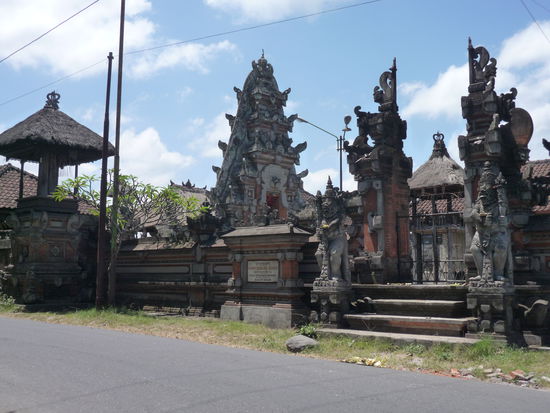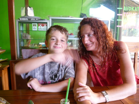 Wir wandern eine Weile durch das Gelände, aber es ist nicht besonders groß. Wir fahren durch Ubud auf der Suche nach einem Restaurant aber hier ist es so voll mit Touristen und die Restaurants entsprechend teuer und auf Ausländer ausgerichtet, dass wir beschließen, lieber außerhalb etwas zu suchen. Wir fahren aus der Stadt raus und gehen in ein Warung, das Seafood anbietet. Der Innenraum ist knallgrün gestrichen und mit bunten Bildern dekoriert. Ein Bild, das eigentlich ein Querformat ist, wurde hochkant neben den Kühlschrank gehängt. Nachdem wir unser Essen bestellt haben, fängt es neben dem Eingang an fürchterlich zu qualmen. Der Koch hat im Hof das Feuer angeworfen und wahrscheinlich die unvermeidlichen Kokosschalen drauf geworfen. Der Wind steht aber günstig und von dem Qualm zieht nichts zu uns herein. Hier trinke ich, wie bereits an anderen Orten in Bali, einen herrlichen Fruchtsaft, direkt aus frischen Früchten mit Eiswürfeln gemixt. Man kann meistens wählen zwischen zwei Sorten von Melone, Mango, Ananas, Papaya und manchmal auch Erdbeeren, die hier sogar wachsen. Nico isst frittierten Tintenfisch, ich gegrilltes Huhn mit Wasserspinat und Thomas einen ganzen Fisch, bedeckt mit Knoblauch und mit leckerer Sauce überbackene Muscheln.