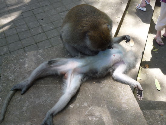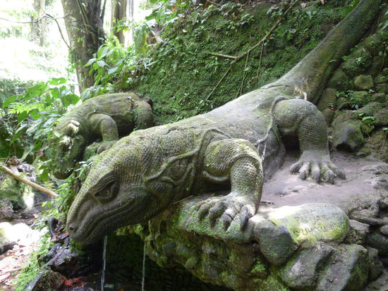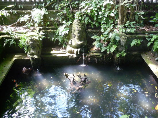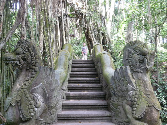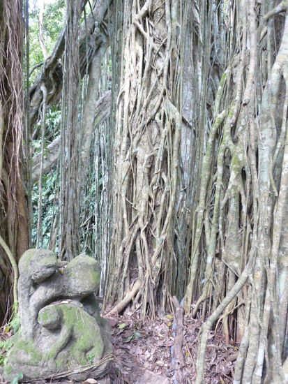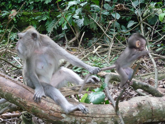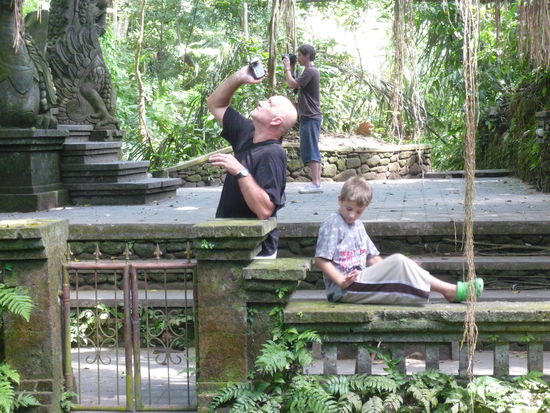 Gleich nach dem Frühstück fahren wir zum Affenwald in Uud. Kaum dass man ihn betritt, begegnen einem schon die ersten Affen und auf allen Wegen wird man von ihnen begleitet. Die Touristen füttern sie reichlich mit Bananen aber trotzdem gibt es Streit darum. Nico ist ganz angetan von den kleinen Klammeräffchen, die am Bauch ihrer Mütter hängen. Wir sind noch nicht lange im Wald, als eine Schlange neben uns her kriecht. Sie ist mindestens zwei Meter lang und grün mit einem schwarzen Strich. Nico ist total begeistert, dass er endlich mal eine echte Schlange in der freien Natur sieht. Überall sieht man die Affen, wie sie sich lausen, balgen oder faul herum liegen. Sie gelten als die Beschützer des heiligen Tempels. Gigantische Bäume bilden den Wald, durch den sich ein Bach zieht und eine heilige Quelle gibt es hier auch. An der einen Quelle kommt Nico mir mit einem nassen Rupiah-Schein entgegen und ruft: "Ich habe Geld gefunden". Da es sich dabei sicherlich um eine Opfergabe handelt, bitte ich ihn, den Schein wieder zurück zu legen.