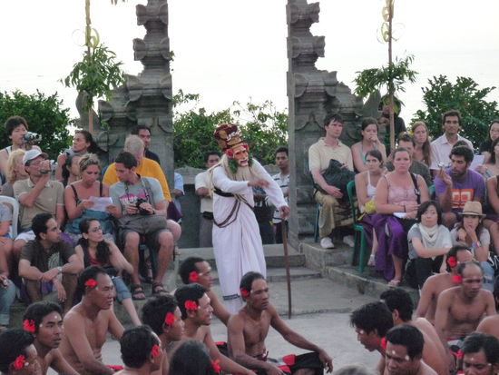 Bei der Rückfahrt kommen wir gut durch, so dass wir direkt weiter nach Uluwatu fahren. Dabei handelt es sich um einen der Haupttempel von Bali direkt an der Steilküste und jeden Abend wird hier um sechs Uhr der Kecak- oder Affentanz aufgeführt. Kaum steigen wir auf dem Parkplatz aus unserem Auto aus, heftet sich uns ein greiser Balinese mit furchtbarem Mundgeruch an die Fersen und simuliert eine Tempelführung, obwohl wir das gar nicht nötig haben, denn es findet sich alles von selbst. Am Eingang gibt es wieder Sarongs für Thomas und mich und für Nico nur die Tempelschärpe. Auf dem Weg zu den Klippen sieht man wieder überall Affen hocken. Na ja, irgendwoher muss der Tanz ja seinen Namen haben. Auch als wir einen Schritt zulegen, schlurft der Mundgeruch-Oppa hartnäckig hinterher und erwischt uns dann wieder dort, wo wir für die Vorstellung bezahlen müssen. Wir geben ihm 5000 Rupiah und er zieht endlich ab. Alle sind zufrieden.