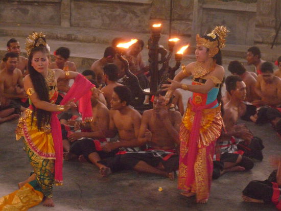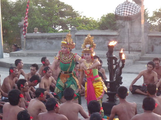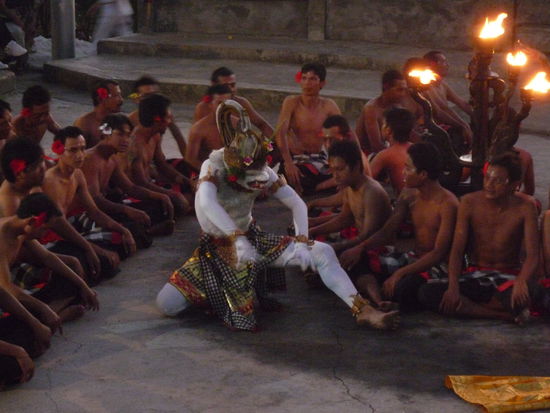 Zunächst erscheinen ca. fünfzig Tänzer, die gleichzeitig für die akustische Untermalung sorgen mit rhythmischen Lauten und Singsang dazu. Die Geschichte, die hier in Szene gesetzt wird, stammt aus dem hinduistischen Sagenepos Ramayana und erzählt davon, wie das Prinzenpaar Rama und seine Frau Sita in Begleitung seines Bruders Lakshmana in den Wald verbannt werden, wo der böse Dämonenkönig Sita in sein Schloss entführt und dort gefangen hält. Mit Hilfe des Affenkriegers Hanuman gelingt es Rama, seine Geliebte zu befreien. Am Anfang ist Nico immer noch am maulen: "langweilig, öde", als aber die ersten Dämonen auftauchen und schließlich auch Hanuman, der gegen sie kämpft und sich aus einem Feuerring befreien muss, da ist er auf einmal ganz begeistert und voll bei der Sache. Die zeitliche Abstimmung passt optimal. Der erste Teil findet vor der malerischen Kulisse des Sonnenuntergangs statt und als es schließlich dunkel ist, folgen die Szenen mit dem Feuerring. Das ist perfekt gemacht, die Atmosphäre großartig und wir sind am Ende alle begeistert.