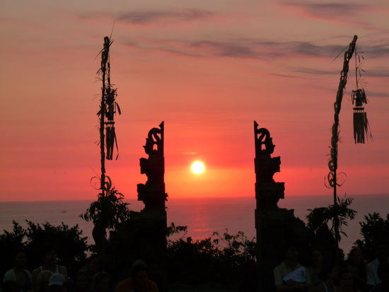 Der Blick die Klippen hinunter auf die tosenden Wellen ist recht beeindruckend, vor allem dass es zum Teil kein Geländer gibt, um einen eventuellen Sturz in die Tiefe aufzuhalten. Dann gehen wir in eine Art Amphitheater allerdings mit Holzbänken, wo die Zuschauer gnadenlos zusammengequetscht werden, damit alle, die bezahlt haben, einen Sitzplatz bekommen. Wir finden genau in der Mitte welche mit direktem Blick auf den Sonnenuntergang. Nico mault die ganze Zeit rum. Zuerst darüber, dass er die doofe Schärpe tragen muss. Dann ist die Empörung riesengroß, als man ihm am Eingang zur Vorführung seinen Kampfstock abknöpft und als wir auch noch eine halbe Stunde warten müssen, wird es nicht besser. Die Vorstellung beginnt, als die Sonne anfängt unter zu gehen.