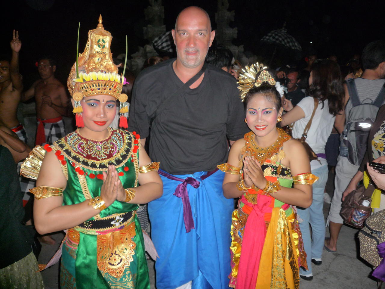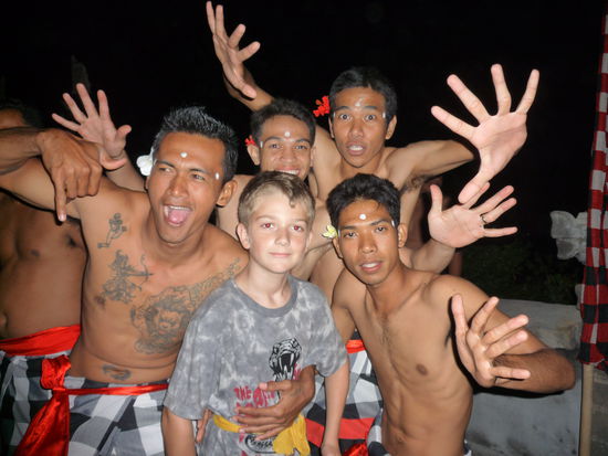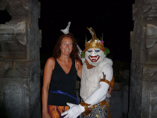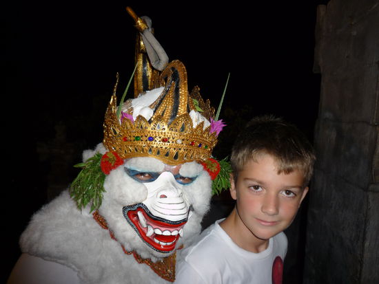 Die Zuschauer werden zum Schluss sogar noch dazu aufgefordert, sich mit den Darstellern fotografieren zu lassen und nachdem wir den japanischen Horden den Vortritt gelassen haben, flitzt einer sofort zu seinem neuen Helden Hanuman, um mit ihm geknipst zu werden. Auch der rote Dämon und die coolen Tänzer werden mit ihm verewigt. Schon auf dem Weg zum Auto redet Nico noch ganz euphorisch davon, wie toll das war und dass er unbedingt nochmal hin möchte. Auch weil Thomas eine Kamera mitgenommen hatte, die gerade noch für zehn Minuten Strom hatte und das Ganze eigentlich filmen wollte, sind wir uns schnell einig, dass wir ein zweites Mal kommen werden. Im Auto sagt Nico schließlich: "Das war Heute mein schönster Tag in Bali". Während der Rückfahrt unterhalten wir uns alle noch so angeregt über das Stück, dass wir unversehens am falschen Ende der Insel an einer Sackgasse landen und das mit einer Tankanzeige, die fast schon bei Null ist. Wir schaffen es aber noch rechtzeitig bis zu Tankstelle.