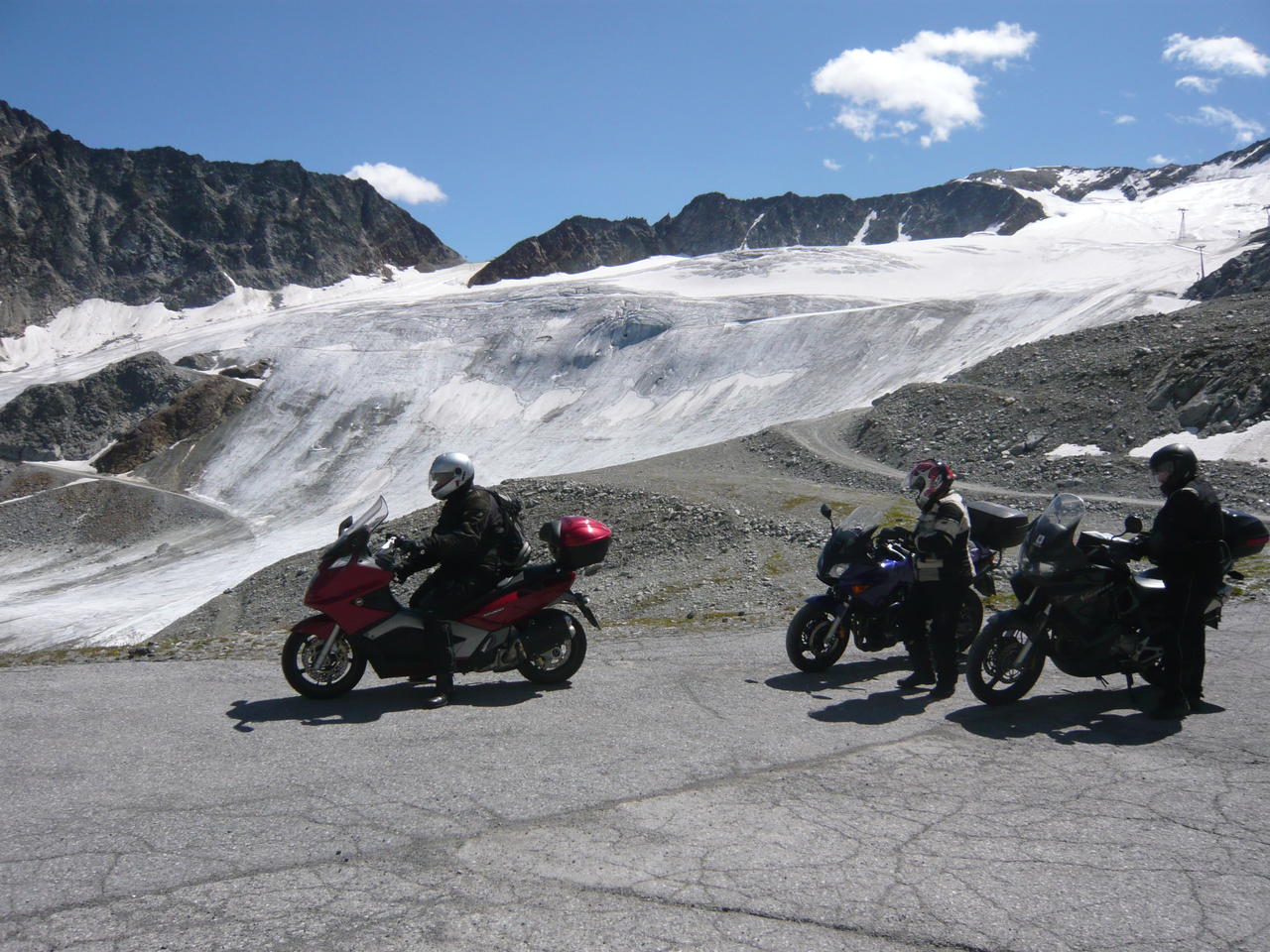 Nach dem Aufstehen und ausgiebigen Frühstück packten wir unsere Fahrzeuge und machten uns auf den Weg in Richtung Meran. Weiter tourten wir durch das Passeiertal hinauf zum Timmelsjoch ( 2474m ü M ) wo wir wieder einige Fotos machten. Von hier oben fuhren wir weiter über die Ötztaler Alpen in das Ötztal. Jetzt kam noch mal ein Highlight. Kurz vor Sölden bogen wir ab auf die Ötztaler Gletscherstraße und fuhren hinauf zum Rettenbach und Tiefenbachgletscher. Dieses Gletschergebiet ist der höchste asphaltierte Punkt den man in den Alpen erreichen kann und liegt auf 2829m ü M. Jetzt staunten wir erstmal bei schönstem Wetter und genossen die Bergwelt. Nachdem wir viel geratscht und gestaunt hatten cruisten wir wieder zurück in das Ötztal und weiter nach Oetz. Von Oetz ging es zurück über Imst und Lermoos nach Wängle wo wir unser Zimmer noch reserviert hatten. Wir hatten abends noch viele Tourgespräche und planten schon die Hessenbembeltour 2012. Wir haben noch gut gegessen und waren alle glücklich dass die Tour so gut verlaufen ist, wir hatten ein wahnsinniges Glück mit dem Wetter, das ist sehr wichtig bei einer derartigen Reise über so hohe Gebiete. Am Montag den 15.8.2011 trennten wir uns in Wängle mit dem Gedanken an die Alpentour 2012 die wir bestimmt wieder fahren werden.