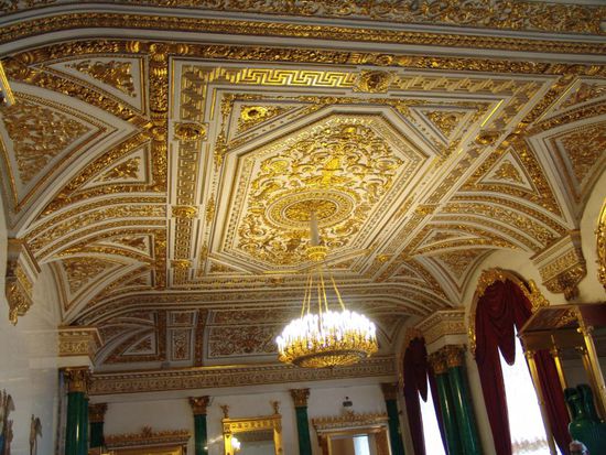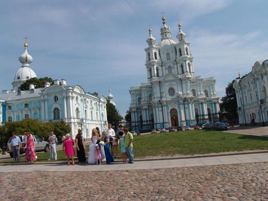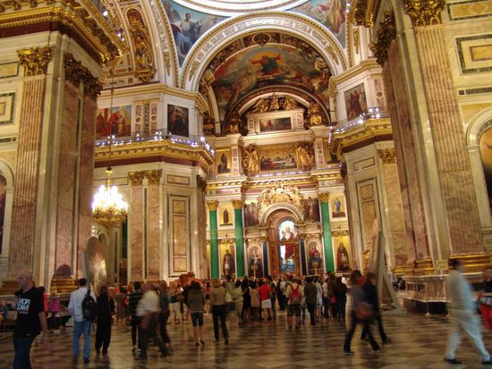 Als Zar Peter der Grosse mit der Gründung der Stadt 1703 Russland ein Fenster zum Westen öffnete, konnte er nicht ahnen, dass dieser Ruf dem späteren Leningrad einmal fast zum Verhängnis hätte werden können. Die einstige Hauptstadt des Russischen Reiches, 700 km nordwestlich von Moskau an der Neva-Mündung gelegen, galt immer schon als offenherzig, intellektuell und widerspenstig. Die schönste Stadt Russlands hat 5 Mill. Einwohner, prächtige Alleen, über 30 Kirchen, Museen und natürlich die wunderschönen Paläste, welche von der jeweiligen Zarenfamilie gebaut wurden, deshalb wurde sie auch ins UNESCO Kultur-Welterbe aufgenommen. Wir werden durch einige Kirchen geführt und erhalten Einsicht in die kirchliche Kunst. Im Russischen Museum erklärt uns Irina einige der hervorragendsten Bilder der russischen Maler. Ganz speziell ist natürlich der Besuch des Winterpalastes mit dem weltbekannten Ermitage-Museum, wo von den prunkliebenden Herrscher einige Tausend Exponate zu besichtigen sind. Ja da kommen wir aus dem Staunen nicht heraus. Ein weiteres Prunkstück ist auch der Peterhof 34 km von Sankt Petersburg entfernt. In 8 Parkanlagen von insgesamt rund 800 ha Fläche. Der grosse Palast liegt etwa 100 m vom Meer entfernt und bildet mit seiner 268 m langen Barockfassade einen eindrucksvollen Rahmen für die 140 Fontänen, Wasserspiele und Kaskaden des Schlossparks.
