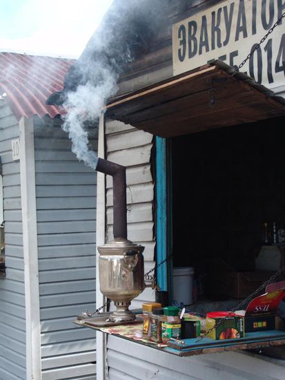 Nach einer kurzen Mittagspause fahren wir weiter auf der M10. Mal ist der Asphalt gut, aber manchmal hat es viele Schlaglöcher oder Bodenwellen. Überall lauern Polizisten mit Radarpistolen, sodass wir uns bemühen die jeweilige Geschwindigkeit von 40 bis 90 km/h genau einzuhalten. Bei Krestcy sehen wir am Strassenrand viele rauchende Samoware. Kaffee und Tee wird hier für die Automobilisten verkauft. Da halten wir natürlich an und trinken einen Kaffee, damit wir die Strassencafes auch fotografieren können. Auf der Weiterfahrt können wir fürs Abendessen Pfifferlinge und Heidelbeeren kaufen.