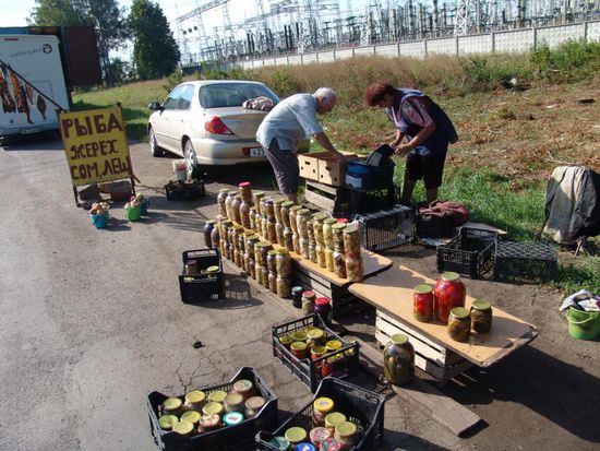 Nach 490 km erreichen wir das Dorf B.Lipowiza. Hier übernachten wir auf einem Feldweg in einer Kolonne (GPS N 52,33,528 E 41,21,250). Die Reiseleitung bringt Fleisch und jeder Teilnehmer bringt eine kleine Schüssel Salat, somit ist der Grillabend organisiert.