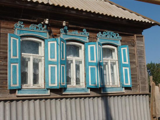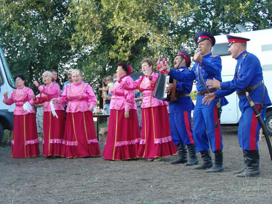 Nach 330 km erreichen wir das 600-Seelen Kosakendorf Rogoschin und stellen uns auf dem Fussballplatz rundherum auf. Auf einem Spaziergang im Dorf finden wir einen kleinen Laden und kaufen 1 kg Zwetschgen. Ansonsten gibt es im Dorf nicht viel zu endtecken. Abends kommt ein Kosakenchor und singt uns schöne rusische Lieder von der Wolga und dem rusischen Leben. Es gibt selbstgebrannten Wodka zu trinken und Brot mit Wurst und Gukensalat werden herum gereicht.