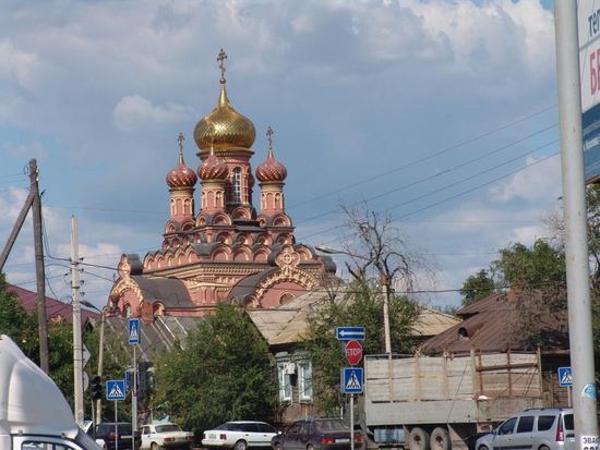 Um aus dem Moloch Moskau hinaus zu kommen, starten wir im Konvoi um 06.00 Uhr. Der Verkehr ist jedoch schon gross und wir brauchen 1 Std. um auf die äussere Ringautobahn zugelangen. Ab hier nehmen wir die Strasse M6 mit der Beschilderung Wolgograd / Astrakhan. Mit dem Navi klappt das alles wunderbar. Wir fahren nun Südostwärts, weitab der klassischen Touristenroute. Riesige Felder, Auenland und Birkenwälder wechseln sich ab. Unterwegs halten wir hie und da an, um bei den Strassenhändlern Pilze, Gemüse oder Beeren zu kaufen. Im Ort Elektrik werden an den Ständen eine Art Lebkuchen verkauf, welche mit Kondensmilch, Marmelade oder Nüssen gefüllt sind. Wir kaufen 2 Stück um sie zu probieren. Auf dem Parkplatz in Zimarowo halten wir bei einer schönen orthodoxen Kirche mit blauen Kuppeln. Hier machen wir Mittagshalt und essen die Lebkuchen, welche nicht unseren gewohnten Lebkuchen entsprechen, jedoch auch gut schmecken. Leider ist die Kirche gesclossen und wir können sie nur von aussen betrachten.