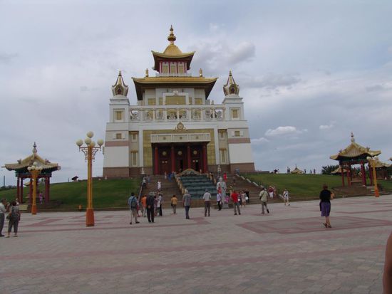 Auf der A 154 geht es wieder knappe 150 km geradeaus durch die ewige weite und einsame Steppe. Elista, die Hauptstadt Kalmückiens ist auch die Hauptstadt des Schachspiels. Der Denksport ist sogar Pflichtfach in der Schule. Der Komplex City Chess wurde 1998 gebaut, um hier die Weltmeisterschaft im Schach auszutragen. Auf dem Parkplatz vom City Chess (GPS N 46.17.900, E 044.17,992) übernachten wir. Hier fragen uns zwei Studentinnen, was wir hier eigentlich wollen, denn Elista wird selten von Touristen besucht. Per Bus fahren wir in die Stadt, schauen uns den neuen Churul, den zentralen Buddhatempel an, denn Kalmückien ist das einzige europäische Gebiet mit buddhistischem religiösen Hintergrund. Nach dem Tempelbesuch laufen wir zum nahegelegenen Zentralplatz und können den Schachspielern zusehen, oder die vielen Hochzeitsgesellschaften bewundern.