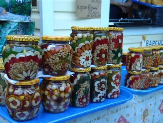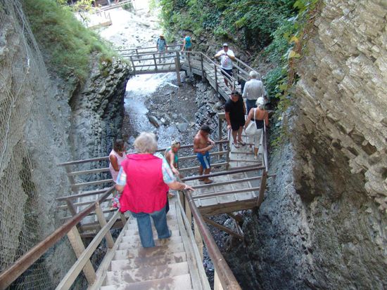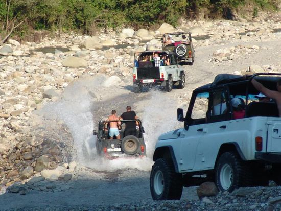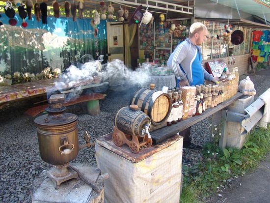 Mit alten russischen Militärlastwagen werden wir danach durch ein Bachbeet gefahren, so dass das Wasser hochspritzt. Eine Hängebrücke bringt uns zu einem Wasserfall, bei welchem wir über viele Holztreppen bis nach oben steigen können. Für viele wird es sehr anstrengen bei der grossen Hitze, aber bei den dazugehörigen Souvenirläden gibt es auch Bier und geräucherter Käse aus der Region. Der Käse aus Ziegenmilch mundet uns sehr gut und wir kaufen gleich 2 Laibe für die Weiterreise. Wieder zurück beim Restaurant gibt es noch eine Wein- und Schnaps-Probe. Der russische Wein ist nicht gerade nach unserem Geschmack und der Wodka mit Honig finden wir auch zu süss. Zum Abendessen bestellen wir eine Suppe und eine Forelle gepacken. Suppe war wie immer in Russland sehr gut, die Forelle war vielleicht wegen der heissen Jahreszeit sehr trocken. Nach diesen Köstlichkeiten wurde von einer Tanzgruppe ein Unterhaltungsprogramm dargeboten. Um MItternach waren alle froh, wieder die Heimreise anzutreten.