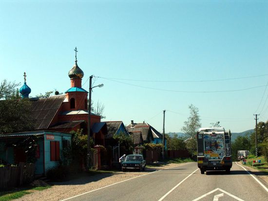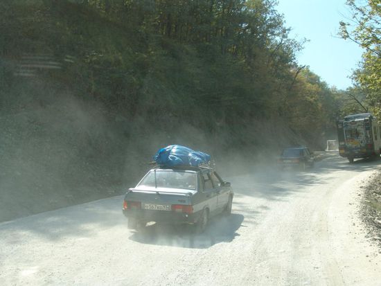 Unser Reiseleiter macht uns bei jeder Fahrtbesprechung auf häufige Polizeikontrollen aufmerksam, jedoch wir spüren davon bis heute nicht, wir passieren unterwegs zwar viel Polizei, werden jedoch nie angehalten. Die heutige Etappe führt uns 170 km bis zum Schwarzmeerstrand in Agoi. Leider ist die Strasse sehr schlecht und über einen Pass ist sogar 5 km kein Asphalt, was sehr viel Staub aufwirbelt, besonders wenn uns die Lastwagen und Pkws überholen. Die westkaukasische Hügellandschaft geniessen wir aber trotzdem. Die Passhöhe bei 420m ü.M. schmückt ein Denkmal mit dem Spruch von Alexander Newskij "Wer mit dem Schwert zu uns kommt, wir mit diesem Schwert ums Leben kommen". Die Ueberreste des zweiten Weltkrieges bestätigen diesen Spruch.