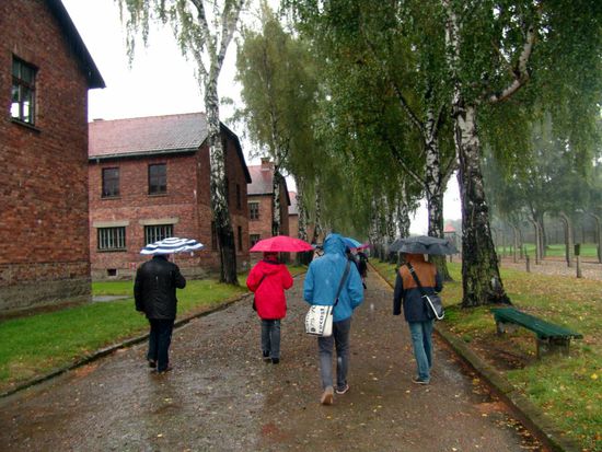 Bei regnerischem Wetter fahren wir nach Auschwitz und buchen eine Führung durch das Lager Auschwitz I und das 3 km entfernte Lager Birkenau. Die Führung dauert 3 Stunden im strömenden Regen, was gut zu der traurigen Geschichte passte.