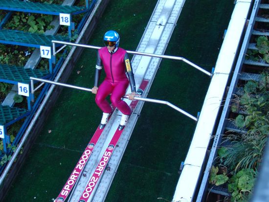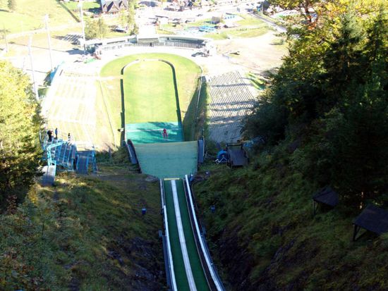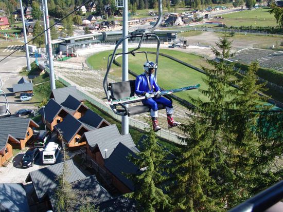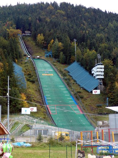 Im Leben ist es zum Glück so, dass nach trüben Tagen auch wieder die Sonne schein. Bei schönstem Herbstwetter fahren wir nach Zakopane und nisten uns gemütlich am Rande des Hochgebirges "Hohe Tatra ein auf dem Campingplatz Pod Krokwia (GPS N 49, 16, 58.9 E 19, 58, 10.0). Von unserem Womo aus haben wir direkte Sicht auf die Grosse Flugschanze, wo schon fleissig für die kommende Saison trainiert wird. Auf einem Spaziergang durchs Dorf und den Markt kaufen wir Pilze und eine Rolle, des aus dieser Region typischen geräucherten Käses. Am späteren Nachmittag kommt Regen auf und es wird etwas kälter. Beim Spaziergang zur Schanze können wir zusehen wie die Jünglinge trotz Regen eifrig trainieren. Andern Tags, bei wiederum schönem Wetter lassen wir uns mit dem Sessellift zum Anlauf der grossen Flugschanze bringen. Die jungen Männer, welche hier Anlauf nehmen sind schon sehr mutig, denn uns wird es fast schwindlig, wenn wir von oben hinuntersehen zum Auslauf.