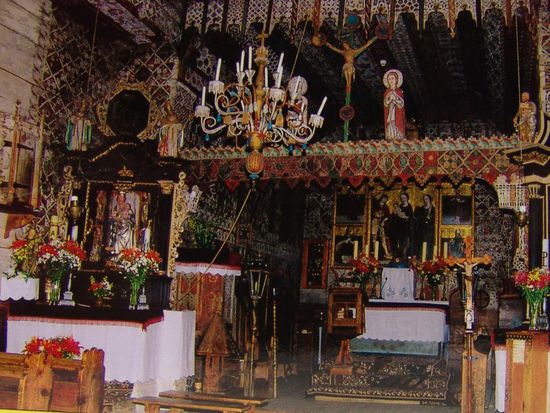 Wir verlassen Zakopane und fahren Richtung Nowy Targ. In Debno besichtigen wir die berühmte Erzengel-Michael-Holzkirche. Die Kirche wurde im 15. Jh. aus Lärchenholz gebaut. Nicht ein einziger Nagel hält den Bau zusammen, es wurden ausschliesslich Holzdübel verwendet. Am beeindruckendsten sind die renaissance-gotischen Malereien im Innern. 33 Farben wurden verwendet und das Erstaunlichste ist, dass immer noch die originale 500 Jahre alte Farbe so deutlich zu sehen ist!