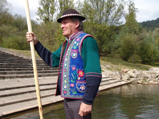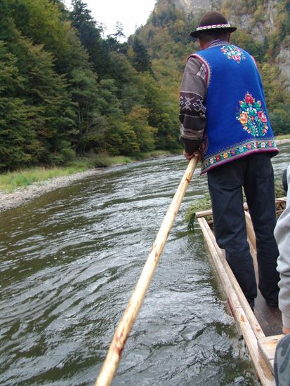 Auf unserer Weiterfahrt durch die hügelige Landschaft kommen wir an den Fluss Dunajec, welcher in der Hohen Tatra entspringt. Wir folgen den Schildern zur Flossfahrt, denn hier im Pieniny- Nationalpark an der Grenze zur Slowakei, werden Flossfahrten angeboten. Die 5,75 m langen Flösse bestehen aus 5 zusammengebundenen, 45 cm breiten Kähnen, die früher aus ausgehöhlten Baumstämmen, heute aus Brettern zusammengefügt sind. Drei Querbretter bieten Sitzgelegenheiten für 10 Passagiere. Am Bug werden Tannenzweige als Wellenbrecher angebracht. Gesteuert werden die Flösse von einem Meister und einem Helfer am hinteren Ende mit langen Stöcken. Schon seit 1832 werden hier traditionell von den Bewohnern aus den umliegenden Bergdörfern auf dem Dunajec Flossfahrten unternommen, damals wurde Holz bis zur Ostsee geflösst. Heute werden Touristen auf einer 3-stündigen Fahrt transportiert und es ist die Haupteinnahmequelle der hiesigen Bewohner. Unterwegs weisen die Flösser auf die landschaftlichen Höhepunkte und die Sehenswürdigkeiten am Ufer des Flusses hin, natürlich in polnischer Sprache. Einer unserer Flösser hat 10 Jahre in der Schweiz bei Gemüsebauern gearbeitet und übersetzt uns die Erzählungen. Die wunderschöne Fahrt endet in Szczawnica, neben den unvermeidlichen Verkaufsbuden. Der Rücktransport nach Sromowce erfolgt per Kleinbus. Nach diesem erlebnisreichen Tag übernachten wir gleich auf dem Parkplatz.
