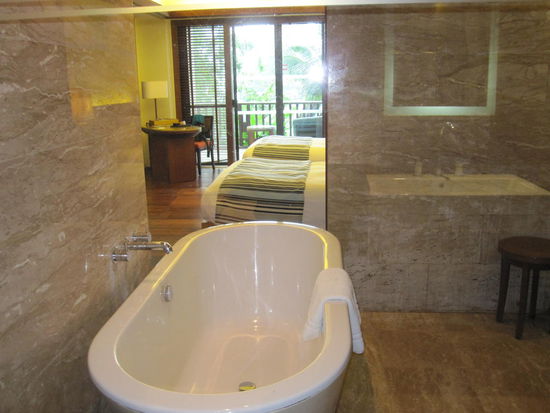 Als wir ankamen regnete es. Die Zimmeraussicht entschaedigte jedoch fuer alles. Wir hatten einen traumhaften Blick ueber das Meer. Auch die 80qm-Zimmer liessen mit freistehender Badewanne nichts zu wuenschen uebrig.