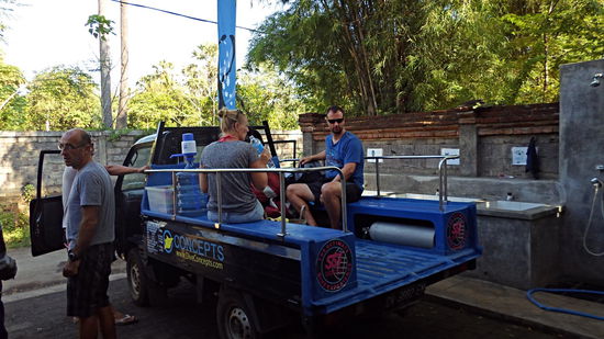 Mit dem öffentlichen Bus ging unsere Reise weiter nach Pemuteran, wo wir in einer Unterkunft mit integrierter Tauchbasis (Arjune Guesthouse) unsere nächsten 5 Nächte buchten. Wir wurden an der Hauptstrasse rausgelassen und machten uns mit Sack und Pack auf die Suche nach der Unterkunft, wo wir nach 20 Minuten ankamen. Es erwartete uns eine wunderschöne Anlage mit einem Pool und sehr nettem Personal.