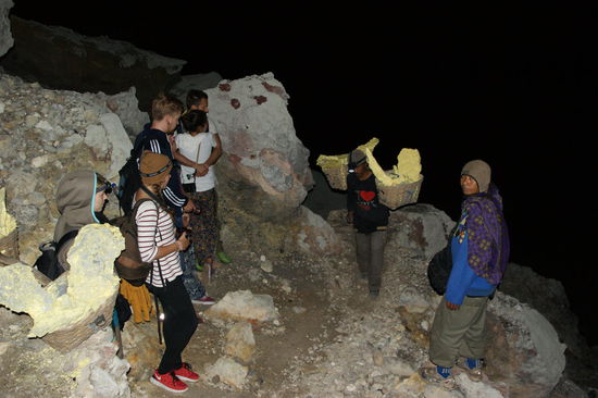 Die Ijen Vulkanbesteiung stand auf dem Programm. Wir starteten mit unserem Guide etwas unterhalb des Vulkanes und waren so in ca. 1 Stunde oben, es ging steil bergauf. Oben angelangt wurden wir mit einem Blick auf das Blue Fire belohnt, doch das war noch nicht alles, wir stiegen in den Krater hinab, wo uns immer wieder die Arbeiter, die Schwefel abtransportierten begegneten. Nach wiederum 1 Stunde waren wir im Krater unten angekommen und sahen das Blue Fire von nahem. Immer wieder kam uns eine Schwefelwolke entgegen, die in Lungen und Augen sehr stark brannte. Wir konnten den Arbeitern zuschauen, wie sie den Schwefel abbauten und hochtrugen. Es ist unglaublich, Sie tragen bis zu 100 Kg auf ihren Schultern und das bis zu drei mal am Tag. Der Verdienst ist umgerechnet 7 Rappen pro Kg und wir haben sehr grossen Respekt vor diesen Arbeitern, der härteste Job den wir bis anhin gesehen hatten.