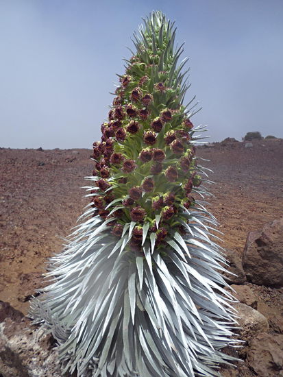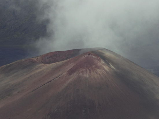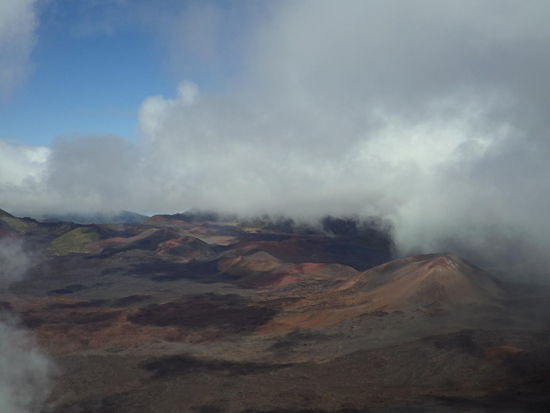 Da wir auf unserer Reise schon sehr viele Sonnenaufgänge und Sonnenuntergänge gesehen hatten, liessen wir diesesmal das frühe Aufstehen und machten uns erst nach dem Morgenessen auf in Richtung Haleakala NP. Mit dem Auto kann bis zum Gipfel des Mount Haleakala gefahren werden, was die Sache erheblich erleichterte. Unterwegs hat es immer wieder geregnet, auch ganz Oben erwartete uns Regen und eine dicke Wolkendecke. Enttäuscht aber auch froh nicht extra früh Aufgestanden zu sein, fuhren wir zu einem tieferen Aussichtspunkt. Dort hatten wir Glück und die Wolken öffneten sich für 15 Minuten, wir bekamen eine wunderschöne Landschaft mit diversen Kratern zu Gesicht.