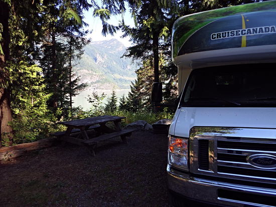 In Horseshoe Bay angekommen galt es nun einen Campingplatz zu suchen. Wir fuhren Richtung Whistler, da es aber schon spät war, suchten wir unterwegs in Squamish, 53 km vor Whistler eine Unterkunft und fanden beim zweiten angefahrenen Campingplatz einen sehr schönen Stelllatz.