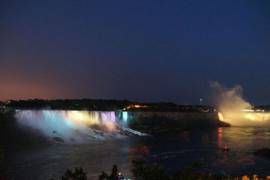 Nach der Ankunft nahmen wir unser Gepäck entgegen und fuhren mit der Metro zu der Autovermietung. Morgens um 01:30 Uhr übernahmen wir das Auto und fuhren die Nacht durch zu den Niagara Falls. Da die Wasserfälle besser von der Kanadischen Seite aus zu bewundern sind, ging es wieder über die Grenze. Die Fahrt war sehr lange und anstrengen, so legten wir uns erstmals im Hotelzimmer schlafen. Am Abend liefen wir zu den Niagara Falls welche sehr schön beleuchten waren. Die Stadt selbst ist wie ein kleiner Vergnügungspark mit Casinos und sonstigen Attraktionen.