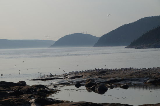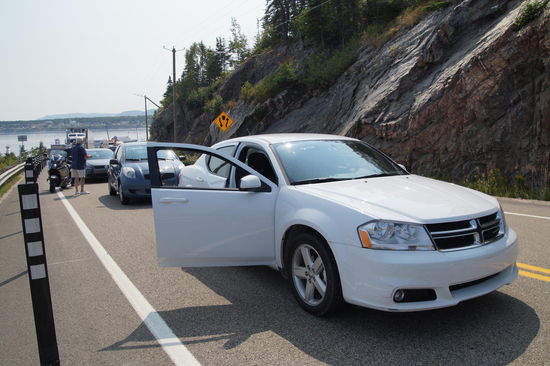 Die 220 km nach Tadoussac hatten es in sich, wir benötigten über 5,5 Stunden. Es hatte sehr viele Lastwagen unterwegs, die Strasse war meistens Einspurig und es ging immer wieder Bergauf so konnten wir selten die gewünschte Geschwindigkeit fahren. Um auf die Fähre zu kommen standen wir dann noch 1.5 Stunden im Stau. Der Stau führte uns der Küste entlang, so hatten wir das Glück Belugawale zu beobachten.