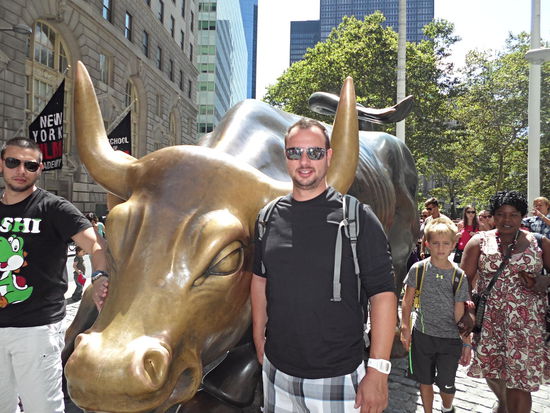 Wir liefen die Wallstreet ab, beobachteten die rauchenden Köpfe der Geschäftsmänner und liefen wortwörtlich mit dem Touristenstrom weiter bis zum berühmten Stier der Wallstreet. Von dem Stier war nur es nur möglich ein Foto zu machen, wenn mit dem posiert wurde, was Marc dann auch machte.