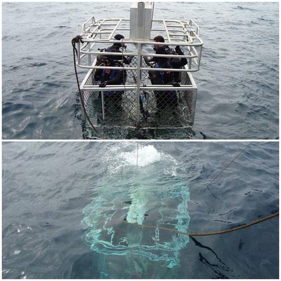 Der Käfig ist über ein Stahlseil, welches wohl definitiv den Attacken des Hais standhalten soll, mit einem Kran auf dem Boot verbunden.