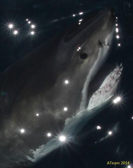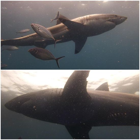 Die größte (im wahrsten Sinne des Wortes) Überraschung war allerdings, dass sich zwei große weibliche Haie eingefunden hatten. Die eine hatte stattliche 4,50 Meter Länge; der Hauptunterschied liegt aber auch im Volumen. Diese Tiere haben nochmal eine ganz andere Verdrängung als die männlichen Kollegen. Hauptgrund ist zum Beispiel die dickere Haut mit dickeren Fettpolstern, um keine größeren Verletzungen von den Bissen der Männchen bei der Begattung zu bekommen, oder auch dass sie im Schnitt wohl so fünf Junge gebären, wovon eines dann auch schon eine Länge von 1,20 Meter - 1,50 Meter hat.