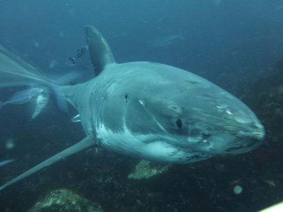 Bei den ersten Tauchgängen war dies aber noch nicht mal wirklich nötig, da uns sowieso schon mehrere weiße Haie von der Oberfläche ab nach unten begleitet haben und uns genauso auch wieder zur Verabschiedung auf dem Weg nach oben nicht aus den Augen gelassen haben.