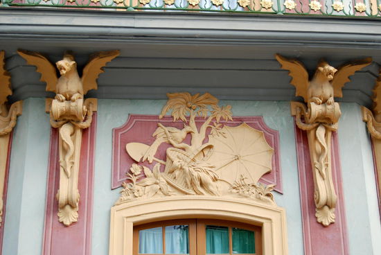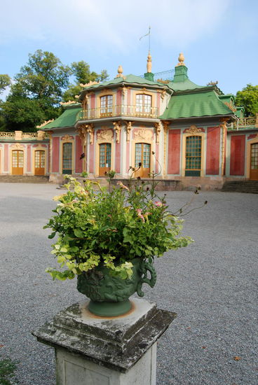 Dann spazierten wir durch den Barockgarten zum Chinaschloß und erreichten es zur letzten Führung. Mitte der 1700er Jahre wurde es gebaut, als China große Mode in Europa war. Es wurde nur den Sommer über bei schönem Wetter und tagsüber benutzt. In einem Nebengebäude auf einem kleinen Hügel war ein Speisezimmer eingerichtet, bei dem der Tisch und einige Regale im Untergeschoß, das direkt von der Küche aus zugänglich war, gedeckt werden konnten und dann als Aufzug nach oben gefahren wurden. So konnten die Herrschaften ganz ungestört speisen.