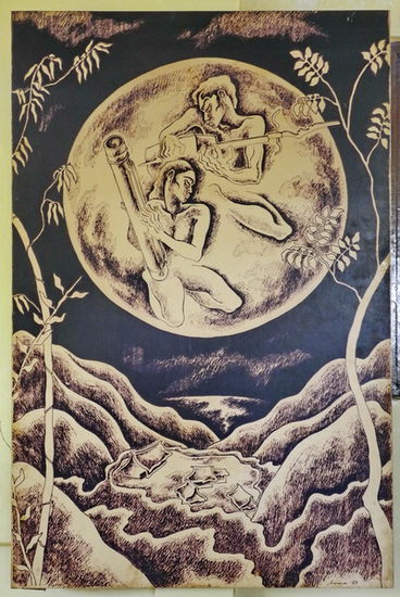 Zwei hübsche Zeichnungen aus Tusche sind mir dennoch aufgefallen. Sie sind Bildern, die ich auf Bali gesehen hatte vom Stil her recht ähnlich. Auf einem sind zwei Musiker dargestellt, mit ihren auf der Insel gebräuchlichen Instrumenten.